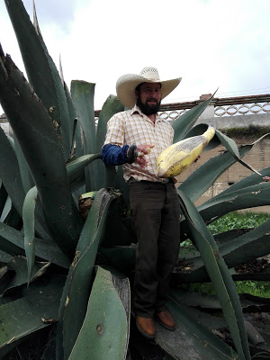 El tlachiquero (así se le llama a la persona que extrae la aguamiel del maguey) te lleva por el campo de magueyes, y con una batea hueca hecha a base de calabaza extrae desde un hueco hecho en el maguey aguamiel, nos ha dado a probar recién extraída y el sabor es como chocolate, es dulce, fresco y delicioso, después de probar las mieles del maguey pasamos a la bodega donde se fermenta y se convierte en pulque.