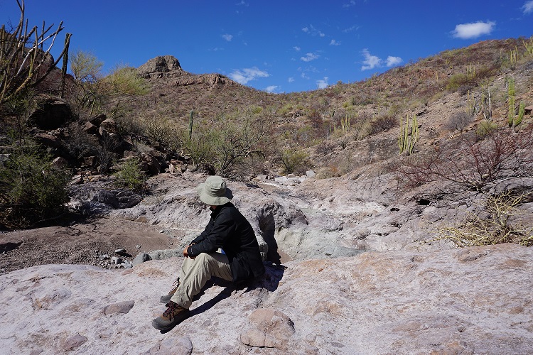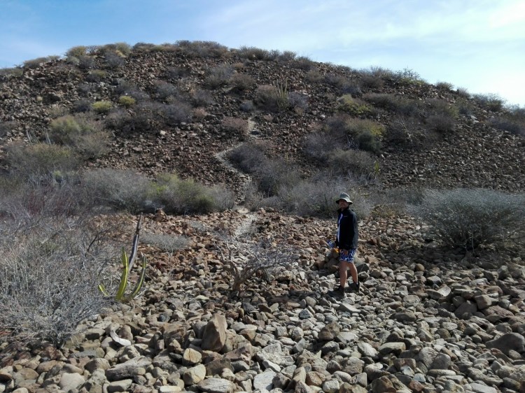 El camino dentro de la sierra es a través de un río seco y está lleno de arena y piedras, estos ríos secos en temporal de lluvias se llenan y son muy grandes, vamos caminando en subida y los pies se hunden en la arena lo que dificulta la caminata un poco, de repente se aparecen liebres muy amigables que al vernos se esconden bajo los árboles secos, porque así es el desierto, seco, parecerá que la vegetación está muerta pero solo está dormida esperando el temporal, caminar cuidando los pasos por aquello de las serpientes y las tarántulas está siendo muy interesante, además nuestro guía es fantástico nos ha mostrado el árbol de copal que huele delicioso, también nos ha mostrado el árbol de la salvia que pinta de rojo y de donde se cree sacaron la pintura los Pericues para las pinturas rupestres.