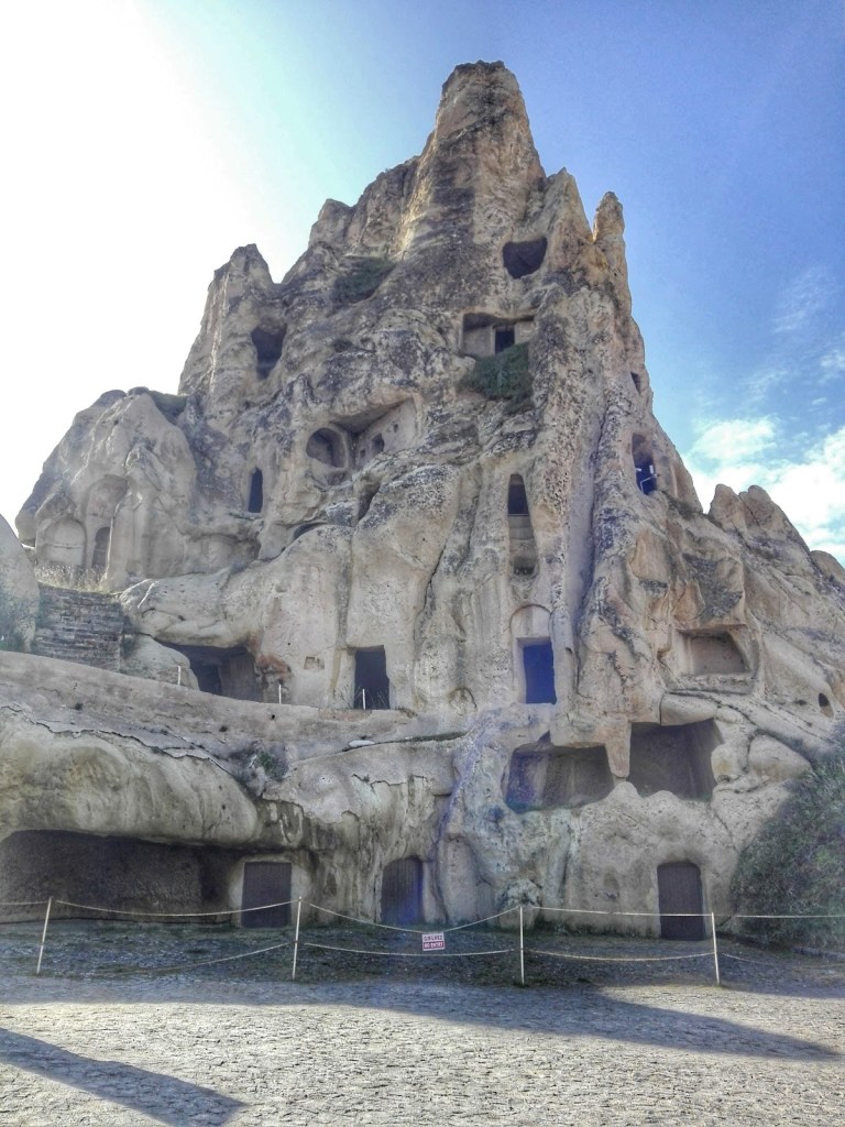 Para llegar nosotros pasamos por el mercado de Cavusin Kilisesi y conocimos a Mehmet un vendedor de artesanías que nos dio un tour por las antiguas cuevas en donde vivió su infancia, una especie de castillo en donde vivían muchas familias, observamos donde fue la cocina, las recamaras y la sala y en verdad fue muy interesante, además subir a este complejo de cuevas no fue nada fácil y en un idioma entre señas, ingles y turco nos explico el porqué de los cuadritos en la fachada y es que Cappadocia es una excelente tierra vinicultora y en los palomares guardan el guano de las palomas para fertilizar la tierra, incluso tienen la creencia que quien no posee palomares no podrá poseer una esposa, la historia en cada una de estas poblaciones nos dejo sorprendidos. Y bueno desde el castillo tuvimos una panorámica muy linda de todo el valle rosado.
