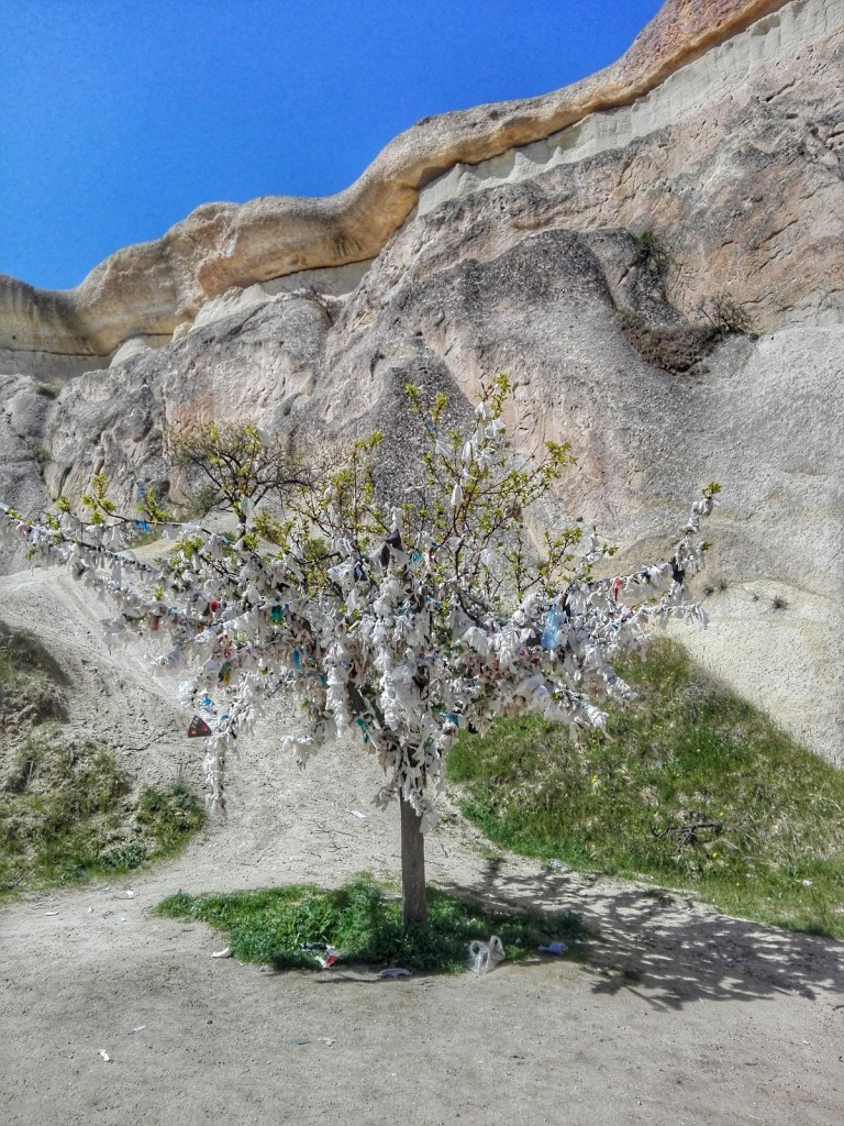 Pasabag Valley: Se encuentra aproximadamente a 7 km de Goreme y en verdad este valle de los Monjes es un sitio muy especial, ya que las cuevas fueron escondite de ermitaños y hay una capilla dedicada a San Simeon, este lugar espiritual con formaciones rocosas con forma de hongo se encuentra en medio de un viñedo y también se le conoce como La viña del Pacha, y aunque no estamos de acuerdo con el maltrato animal, hay paseos en camello para quienes no gustan de caminar, aquí nos llamo la atención un árbol lleno de una especie de listones blancos, al principio pensamos que era basura pero no! estos listones son peticiones de bondad, amor, prosperidad, salud, suerte y fortuna a Hizir el representante fuerte y caritativo de Allah en la Tierra.Esta bonita costumbre tiene que ver con la llegada de la primavera con el nacimiento, la vida y la esperanza. Pasabag es único y realmente vale mucho visitarlo.