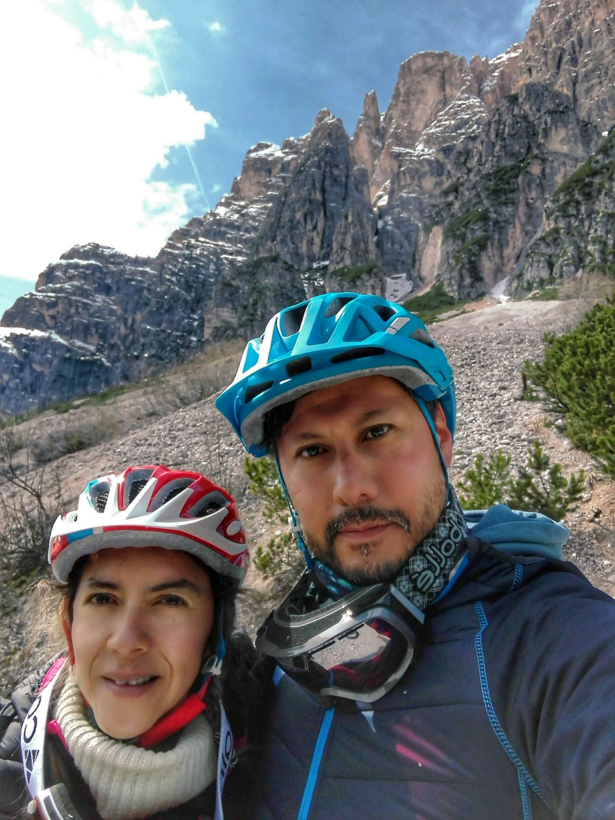 Tre Cimi di Lavadero el fabuloso símbolo de Las Dolomitas esta 20 minutos al norte de Cortina de Ampezzo en la frontera con Austria, el camino es una chulada pasamos por algunas poblaciones alpinas, para llegar hay que ir en auto. Quizá se pueda ir en autobús pero al menos nosotros no vimos pasar 1 en todo el tiempo que estuvimos ahí. Se puede subir a la cima y dar la vuelta a Piccola, Grande y Ovest los 3 picos de Lavadero caminando, incluso hay un albergue donde se puede comer y tomar café con una vista impresionante. Lamentablemente nosotros no pudimos hacer el trekking por el riesgo de avalancha todos los caminos estan cerrados y no nos permitieron pasar la pluma de seguridad. pero eso no importo nada, el estar aqui y verlos ha sido de las grandes emociones de nuestra vida, lo confieso me saco las lagrimas la emoción. De Igual forma nos paso en Cinque Torri las cinco agujas de piedra caliza que se encuentran antes de llegar a Cortina de Ampezzo y a las que por la emoción antes de llegar a Cortina confundí con Lavadero, a estas se puede subir haciendo trekking en el verano desde refugio Scoiatolli hay varias rutas con diferente dificultad, la manera más fácil de subir es en auto hasta el refugio Cinque Torri o subir en telesilla desde el Refugio Baita Bai de Dones para llegar hay que tomar camino hacia Passo Falzarego y estacionar en el aparcamiento del refugio Baita Bai de Dones a solo 20 minutos de Cortina. Tofane ya ni lo intentamos pero lo tuvimos de frente todo el tiempo. En el centro de Cortina hay lugares donde se puede rentar bicis con asistencia para hacer ruta en Cristello y es que estas bicis con asistencia convienen porque las subidas son muy empinadas, en Cortina igual hemos comido solo pizza y rissoto hay solo 3 restaurantes abiertos. No se como sea en el verano pero en la primavera nos ha tocado casi todo cerrado. Pero esto no ha sido impedimento para disfrutar de este viaje, hemos dado una buena rodada en el corazón de Las Dolomitas, subimos a Cristello y después nos tomamos rumbo a Tre Cimi di Lavadero internados en la montaña, una aventura inolvidable.