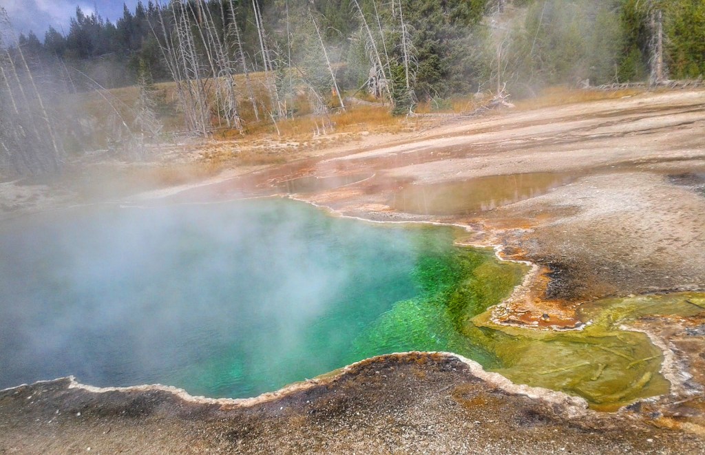 - Midway geyser basin, aquí se encuentra la muy famosa poza termal prismática la más grande del parque y donde se encuentra el géiser Excelsior con 1 km de crater. Es importante aclarar que si el dia esta nublado no se ve el arcoíris en la poza.