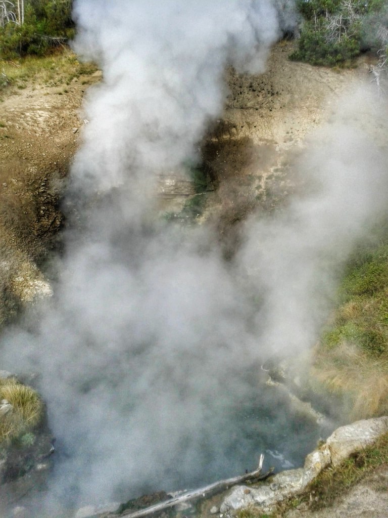No avanzamos mucho más, cuando encontramos las primeras pozas de lodos termales, el volcán esta vivo y respira por todos lados, hay cientos de fumarolas que emanan gas olor a azufre, unos metros más adelante el gran lago Yellowstone.