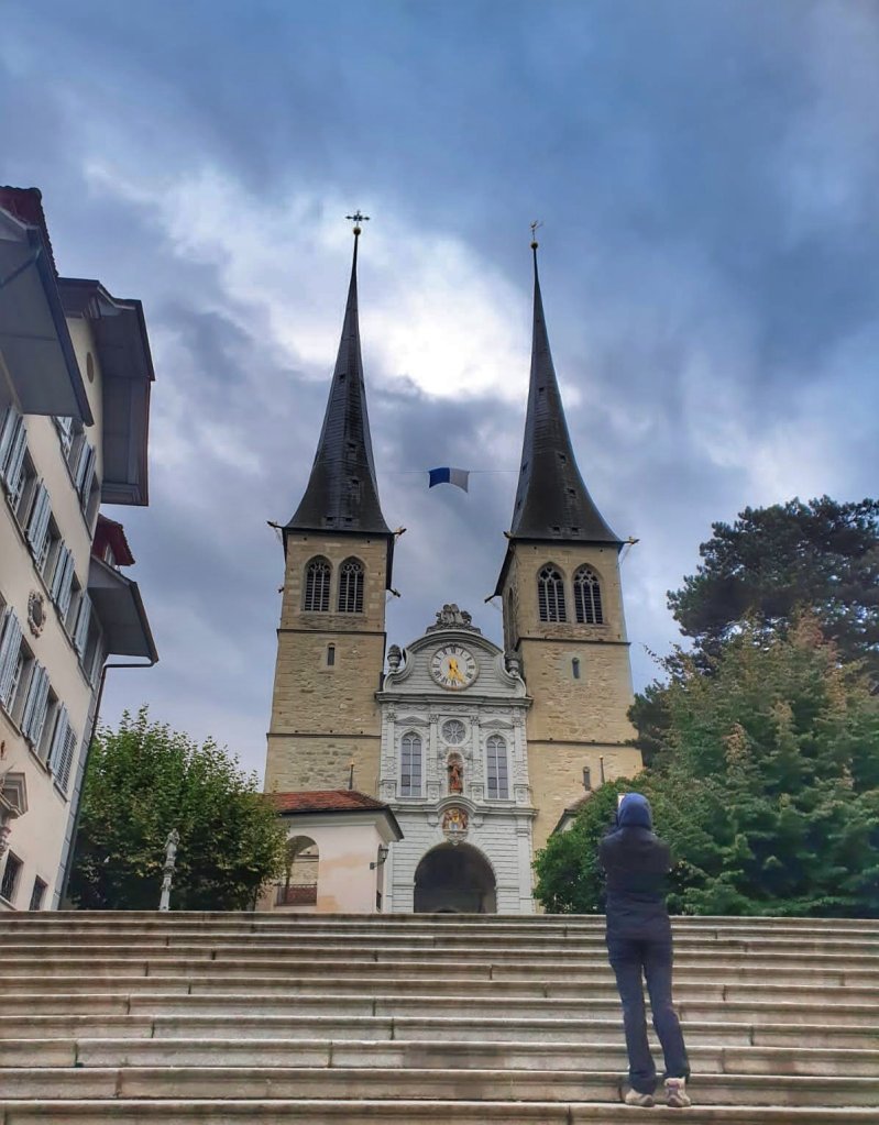 Cruzando la calle del casco viejo hacia el lago se llega a la Catedral de Lucerna, una hermosa construcción de 1639 a la que no pudimos entrar porque con la pandemia los horarios estan restringidos solo a servicios religiosos.