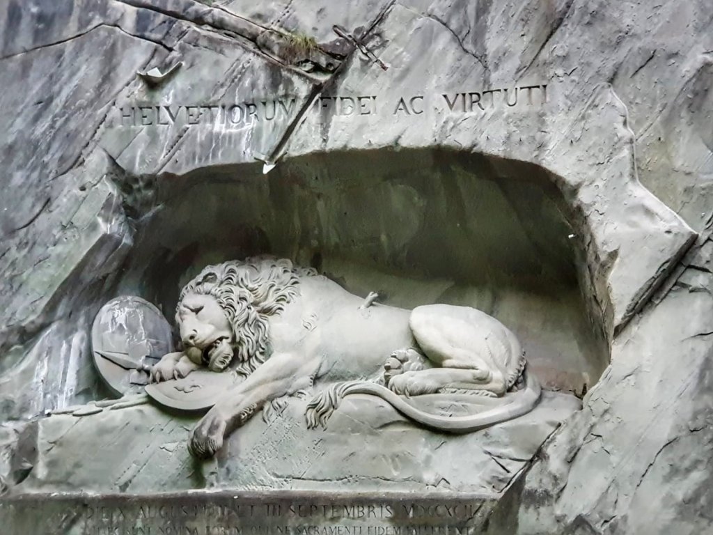 El león de piedra.- Este monumento a los caidos de 1821 es majestuoso, cuando lo investigamos imaginamos un monumento de tamaño normal pero al llegar es imponente la roca esta tallada tan perfectamente que es posible distinguir las heridas del leon, sus lagrimas y a sus pies, el lago donde se refleja. Al verlo se pone la piel de gallina y se despiertan las emociones. Este se encuentra 250 m caminando adelante de la catedral justo junto a la zona arqueologica El jardín de los glaciares donde queda la huella de como hace miles de años Suiza era una zona subtropical.