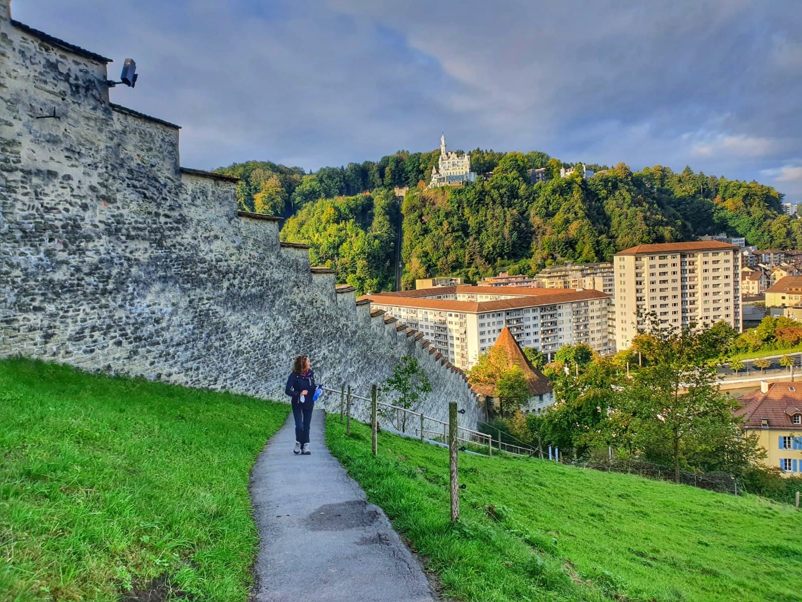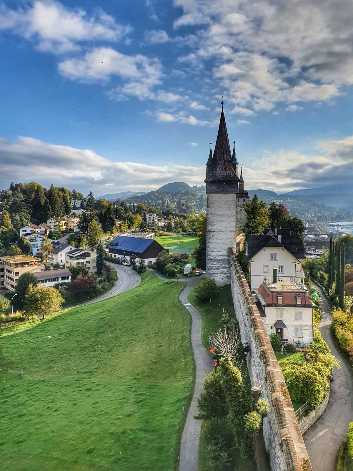 Mussegmauer al final del casco viejo caminando en sentido contrario de la estacion de trenes se encuentra la muralla medieval mejor conservada de Europa, inicia en el rio y da la vuelta casi hasta llegar al lago, pero en realidad no se puede caminar mas alla del casco viejo, pero es posible visitar 3 de sus torres las mismas que se ven desde la orilla del río, hay que subir muchas escaleras para llegar a lo alto de la primera torre y desde ahi tener la mejor vista de toda la ciudad, subiendo a la segunda torre hay un pasillo que conecta con la tercera torre que es un museo del reloj antiguo y estan padrisimos, saliendo de la tercera torre continua el pasillo hasta llegar al final donde las escaleras llevan a un parque donde se puede ver el reloj solar de la ciudad.