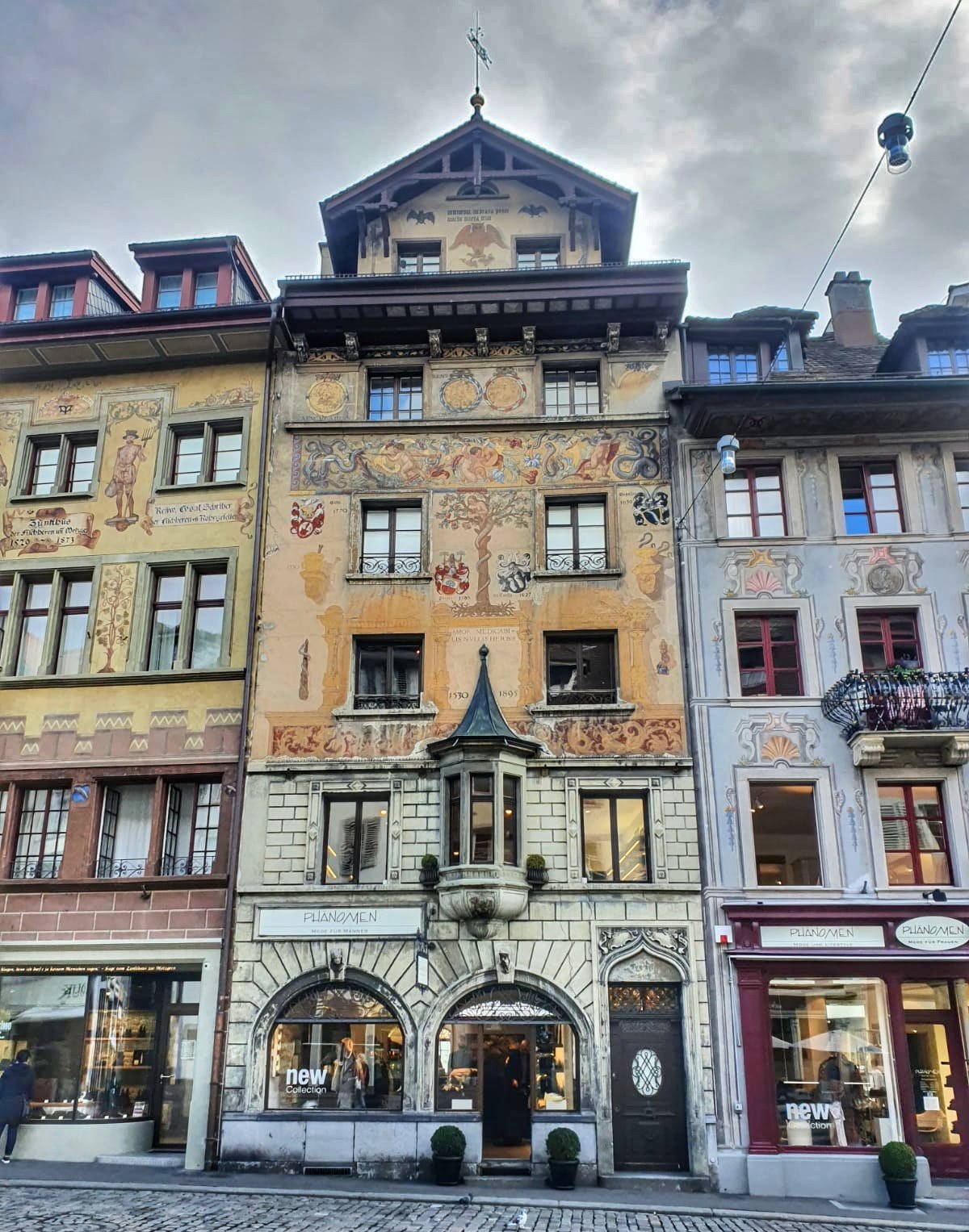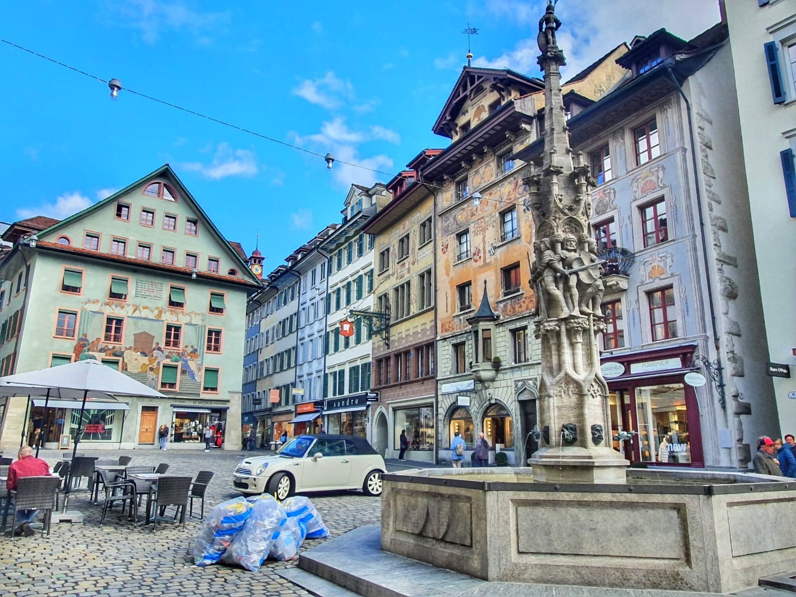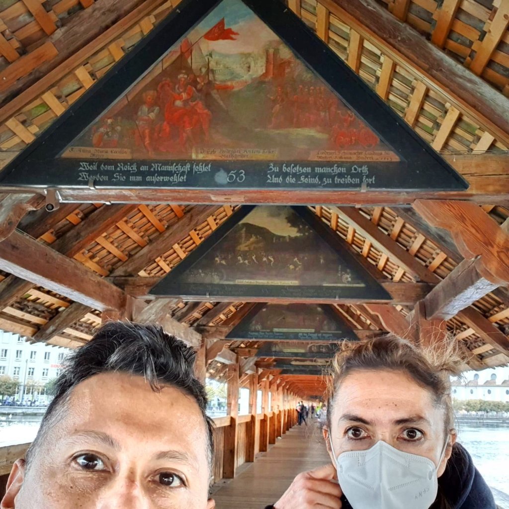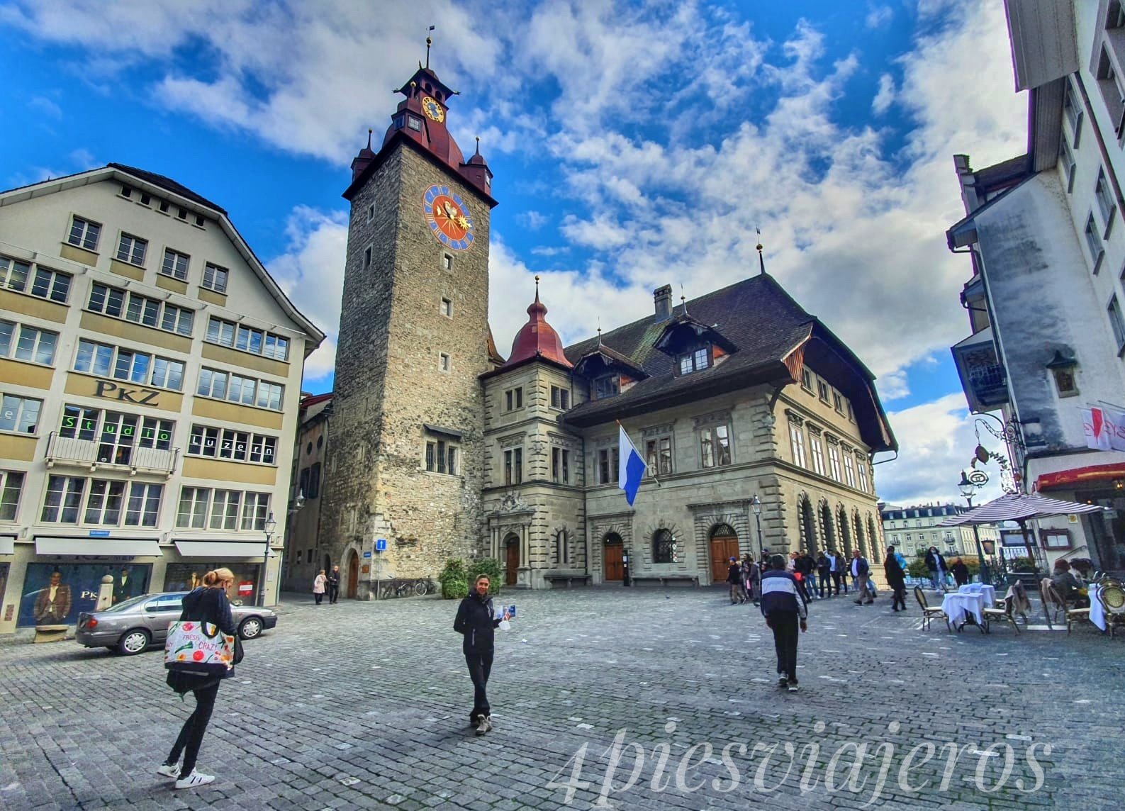 Casco Viejo.- Pasear por las callejuelas no tiene precio y si tu imaginacion es grande como la nuestra la diversion se magnifica. Iniciando en la estación de trenes llegamos al icónico puente medieval de madera Kapellbrüke, en su interior tiene frescos que cuentan fragmentos de historia de Lucerna es el mas largo y cruzando el puente se llega al casco viejo y sabras que has llegado cuando se veas la fuente del carnaval.