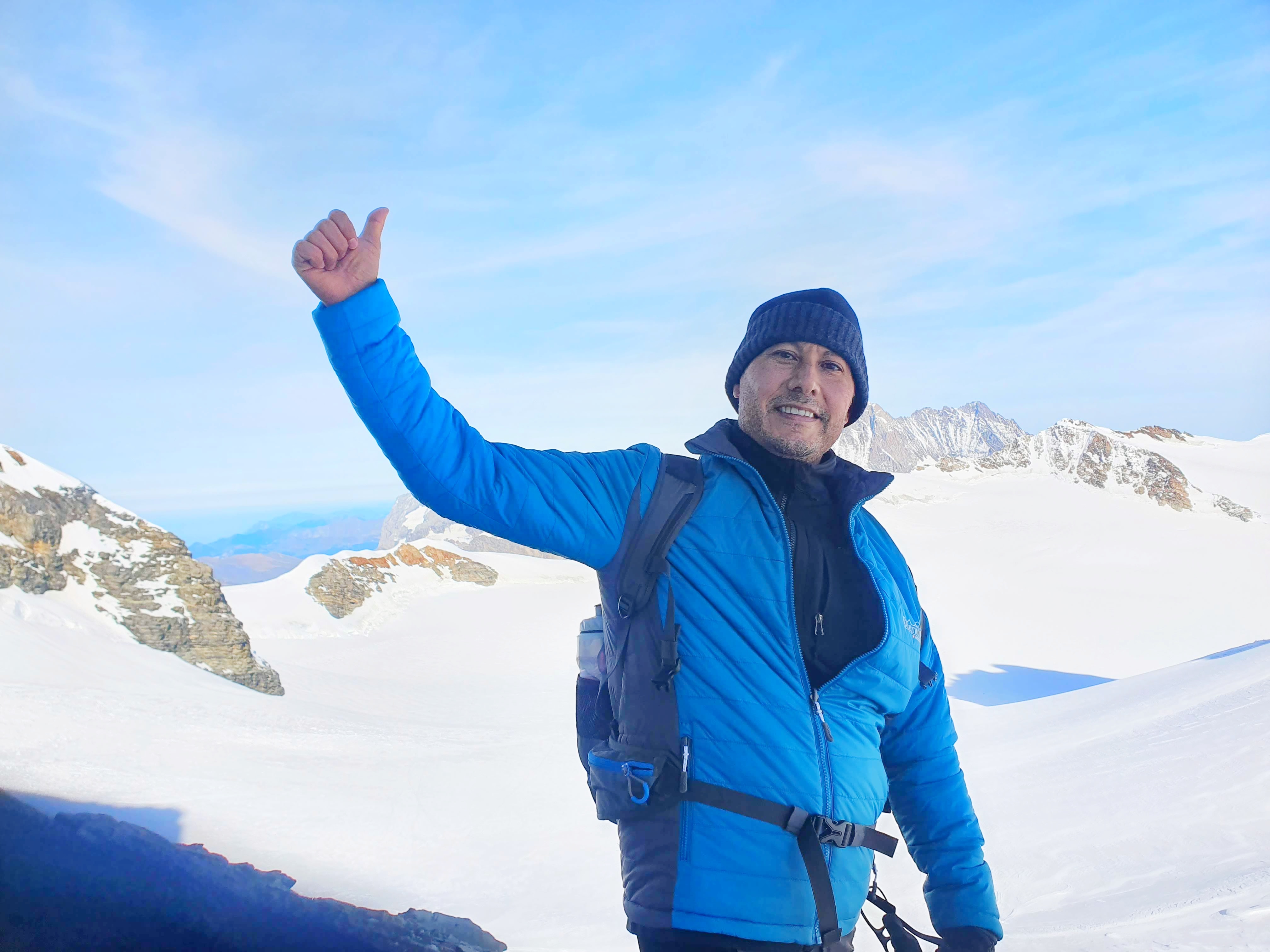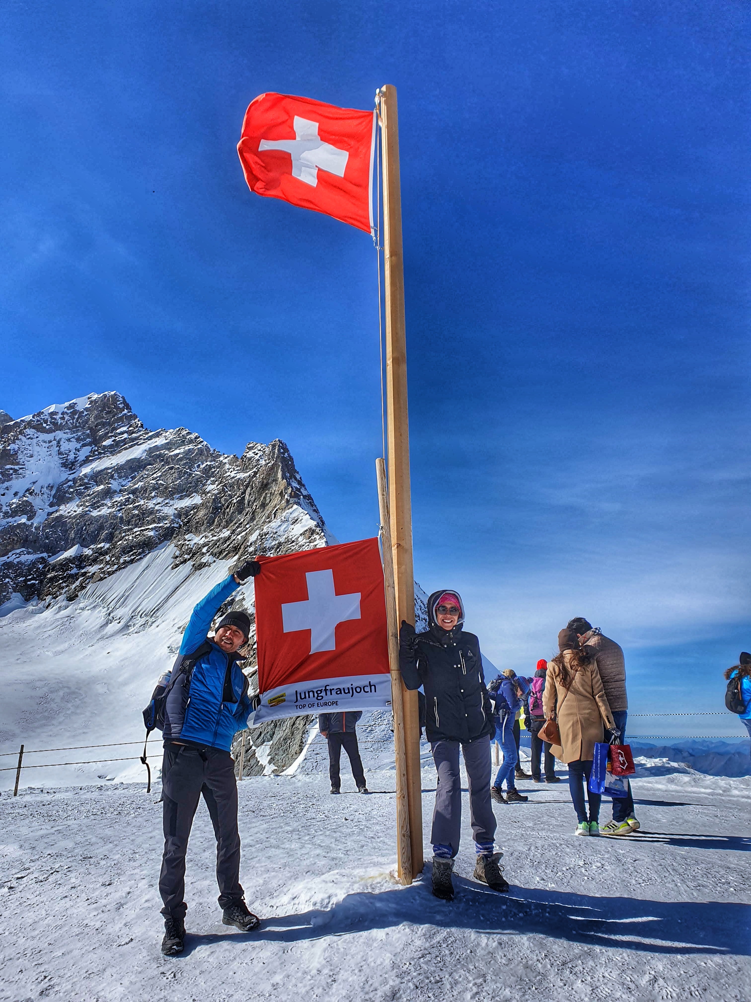 Aqui es donde se pueden hacer fotos con la bandera Suiza como todo un pro del montañismo. Hay 3 restaurantes que se saturan a la hora pico, se puede salir a caminar sobre el plató sin cansarse o se puede caminar hasta el refugio de Eigel pasando a un lado del glaciar y ver desde afuera el observatorio desde donde se mide el cambio climático del planeta, nosotros hicimos senderismo y fue de lo mas emocionante sobre todo cuando toco una ventisca con nieve y nos toco ver un pequeño desprendimiento de un trozo de glaciar, la caminata es en una pendiente lo que lo hace mas cansado y dura aprox 2 horas entre ida y vuelta.