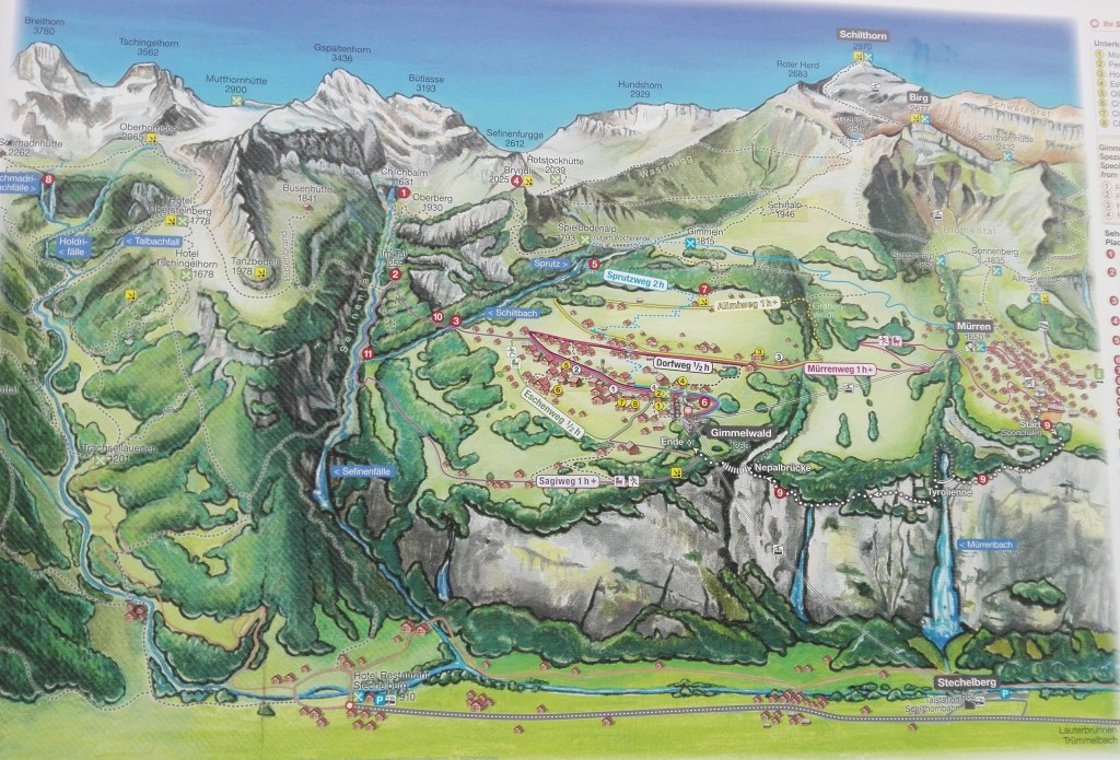 De Murren se llega caminando a Gimmelwald el pueblo ganadero alpino vecino, pocos cientos de metros de distancia y cambia el panorama y se aprecia la verdadera vida montañes, cuidando y ordeñando vacas preparando leche y ese queso delicioso para los raclettes, aqui hay hostales con vistas espectaculares de los 3 grandes Alpes Jungfrau, Munch y Eigel.