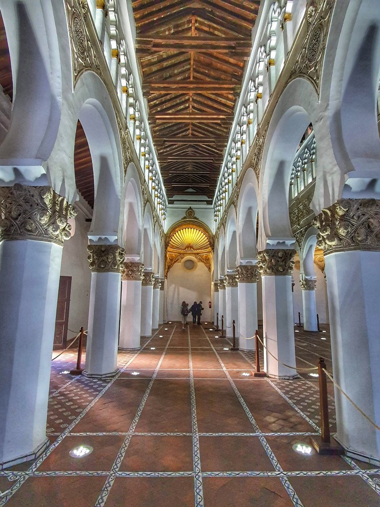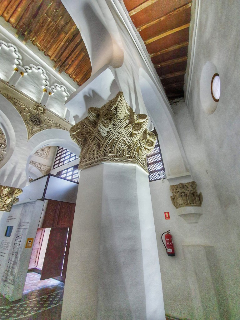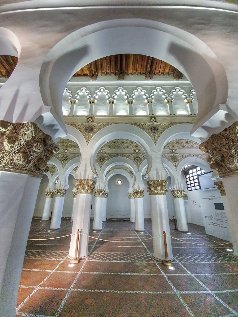 Sinagoga Santa María la blanca.- En su momento fue la mas grande sinagoga de Toledo originalmente se llamaba de Yosef ben Shoshan al convertirse en iglesia catolica tras el pogromo de 1391 se le nombro Santa María la Blanca data del año 1180, de estilo Mudejar tiene cinco naves separadas por columnas coronadas por arcos de herradura. La paz que se respira en este recinto es necesaria cuando el cansancio agobia asi que despues de visitar su interior nos tomamos un tiempo de relax en su jardin exterior en el cual se difruta de la sombra que dan los arboles. Incluida en pulsera turistica.