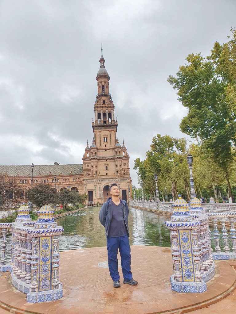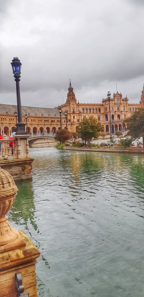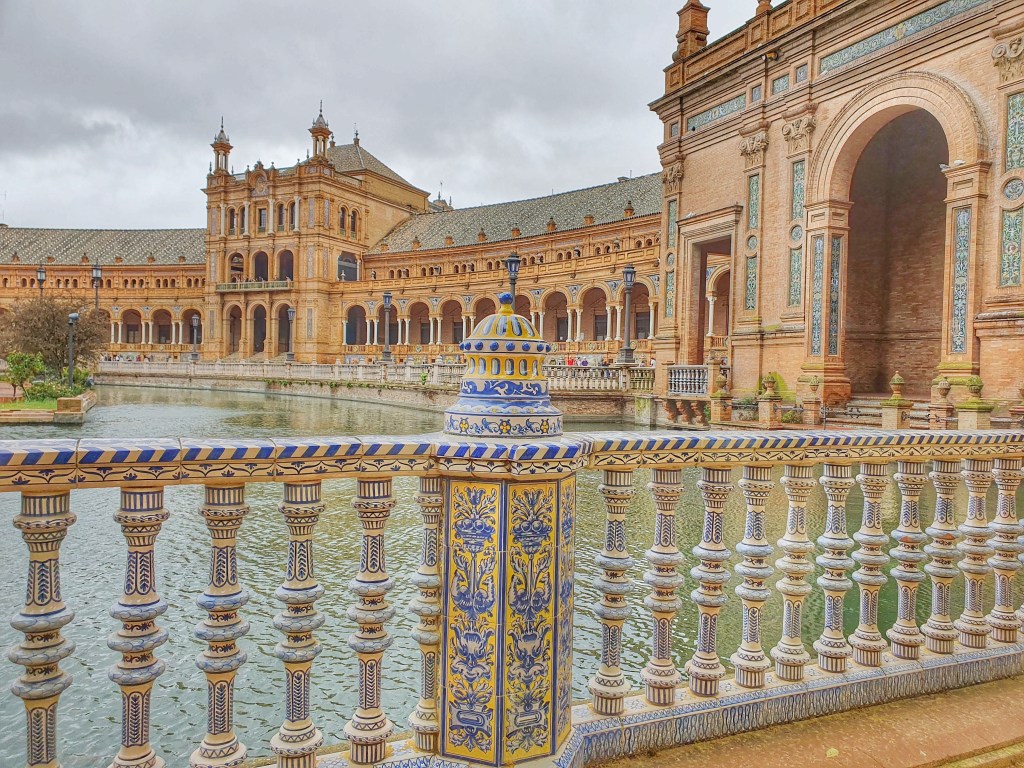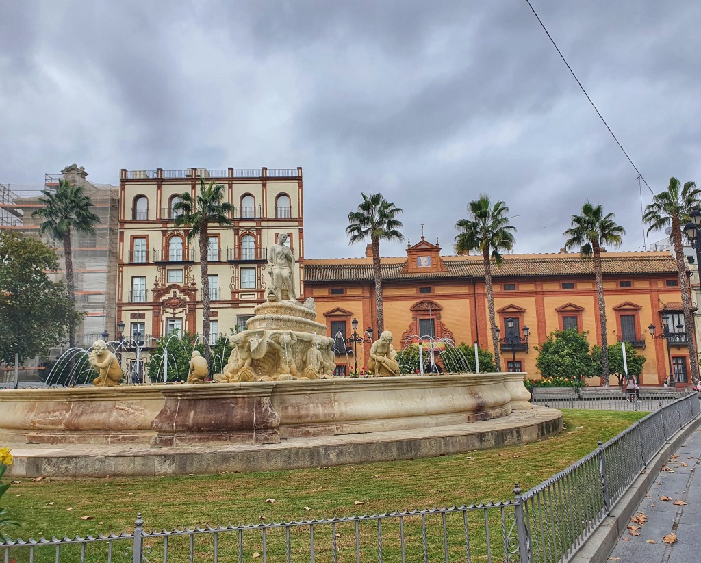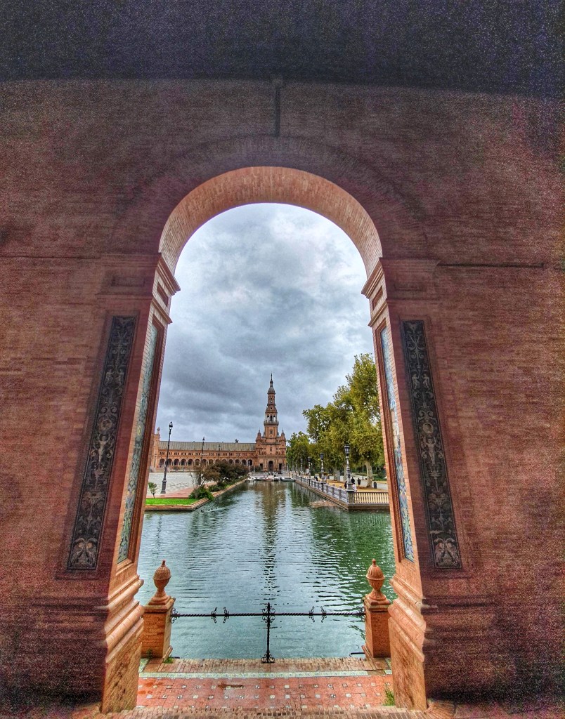 Plaza España.- Es la plaza – palacio mas bonita de España y lo digo en serio, esta plaza ubicada en el parque Maria Luisa se construyo en 1929, esta detallada en talavera, rodeada de jardines y un cuerpo de agua en el centro. Simboliza el abrazo de España a sus antiguas tierras americanas conquistadas y esta en direccion al río Guadalquivir ya que este río conecta al mar y fue desde este río de donde salieron sus carabelas rumbo a America.