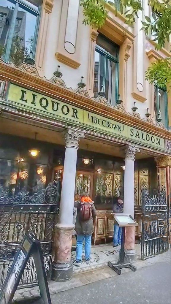 The Crown Liquor Saloon. Este pub es muy famoso por su decoración espectacular y por conservar los privados donde aun se exhiben los letreros metalicos que dicen Match, donde los fumadores prendian los cerillos, el ambiente es muy divertido pero encontrar o espacio en la barra una mesa es complicado porque es muy concurrido.
