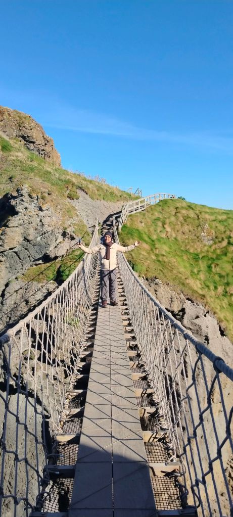 Carrick-a-Rede-Rope Bridge Este famoso puente colgante con 20 metros de largo y 30 metros de alto fue construido hace 250 años para unir la isla de Carrick-a-Rede con el condado de Antrim, durante generaciones pescadores dependieron de Carrick-a-Rede por ser un excelente lugar para pescar salmones. En 2022 se termino la actividad pesquera al cambiar los patrones migratorios de los salmones. La experiencia de cruzar el puente vale mucho la pena, se balancea y hay que tener nervios de acero pero la vista desde Carrick es impresionante, claro que todo el recorrido hasta llegar al puente es espectacular. Para llegar al puente hay que caminar aprox 1 km, hay tramos planos y tramos con escalones de piedra y madera, no es apto para sillas de ruedas. El costo de entrada es de 17 libras, tiene aparcamiento, cafeteria y baños, se puede hacer un recorrido sin pago pero no se llega a el puente.