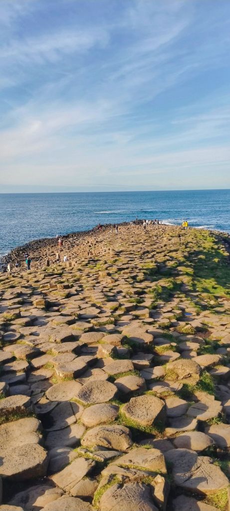 Calzada del Gigante. Ubicado en Bushmills es Patrimonio de la Unesco, la entrada con auto hasta los prismas no esta permitida, sin embargo hay estacionamiento de paga (5 libras). Del estacionamiento a los prismas hay que caminar aprox. 2 km en subida y bajada para llegar a esta alucinante formación geológica, también se puede tomar el único autobús que baja a los prismas en la parada del museo pero tarda un buen en pasar de tanto de ida como de vuelta, asi que nosotros caminamos y disfrutamos del fantástico paisaje que ofrecen los acantilados y el oceano antes de llegar a las 40,000 columnas de basalto por las cuales se puede caminar buscando las formas exagonal y aquellas que tienen 7 u 8 lados, es increible estar sobre estos prismas que se formaron tras una erupción volcanica hace 60 millones de años. Lo curioso es la leyenda irlandesa que cuenta que el gigante Finn Mccool construyo la calzada para cruzar el mar y enfrentarse a su gigante rival escoses Bernandonner, pero al darse cuenta que este era mas grande Finn decidio disfrazarse de bebe para hacer creer a su rival que su padre era mas grande, por lo que Bernandonner huyo despavorido destruyendo la calzada tras de si. Para quienes no deseen bajar a los prismas hay 2 miradores, el de la calzada que esta al inicio y el del anfiteatro que se encuentra una milla adelante, los senderos estan muy bien marcados, aun que la subida de regreso esta pesadita bajar y disfrutar de la brisa y el sonido de las olas rompiendo en los primas es lo mejor.