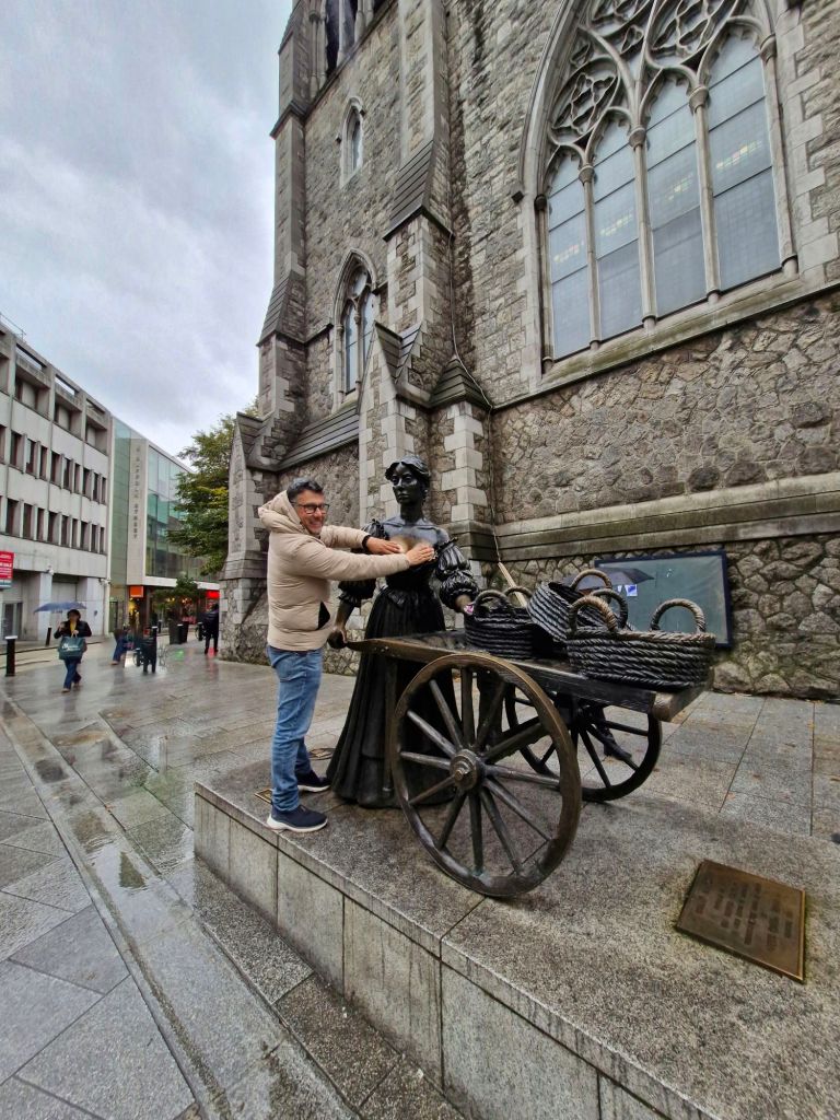Estatua de Molly Malone. Cuenta la leyenda que Molly era una hermosa pero pobre vendedora de mariscos que recorria las calles de Dublín con su carreta llena de ostiones y mejillones vivos, un dia le dio fiebre y murio joven convirtiendose en un espiritu errante que sigue recorriendo las calles de Dublín, gritando «Alive Alive criying cockles and mussels» es un simbolo para los dublineses, en 1883 se escribio la primera canción de Molly que representa la dura vida de Dublín en la antiguedad y aun sigue siendo un himno para los dublinenses. Existe la superstición de tocar el escote de Molly para regresar a Dublín. La estatua se encuentra en la calle Suffolk cerca de la Universidad de Trinity.