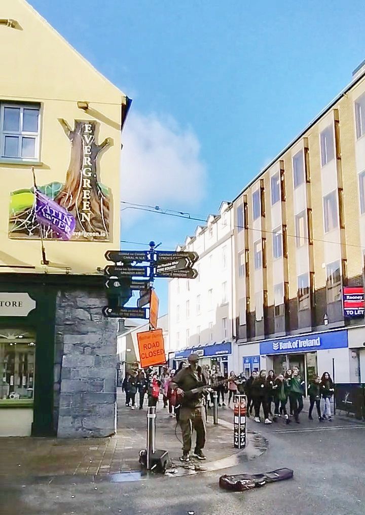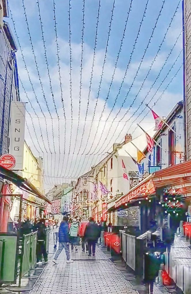 Shop Street.- Es el alma de Galway, su vibrante ambiente hace que sea la calle mas transitada, siempre hay música callejera y bailarines actuando, así como magos y mimos, esta calle se encuentran boutiques, librerias, el café Kings Head Pub el mas antiguo de Galway que data del siglo XII y las estatuas de Oscar y Edward Wilde con las que puedes sentarte a tomar una foto y porque no… si quieres hasta un café, Shop Street de día tiene vida pero de noche esta calle es la onda para quienes buscan diversión muy al estílo irlandes.