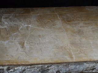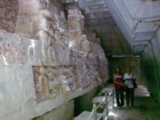 Friso en rojos y amarillo Dios del maíz Cuaderno de viaje;los tenis son indispensables, para recorrer caminando la ciudad amurallada, así como para recorrer las zonas arqueologicas, como siempre mi mayor recomendación, sombrero, bloqueador solar y mucha agua, Campeche cuenta con todos los servicios y sus carreteras están en buen estado, solo algunos accesos a las zonas arqueologicas son terrazeria y ahí si que no hay nada de servicios.