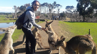 Punto de llegada Melbourne, después de 20 horas de vuelo, llegamos a Melbourne, en el mismo aeropuerto tomamos el auto de renta y nos dirigimos a Philip Island, un pueblillo peculiar de surfers, que se encuentra a 2 horas de Melbourne, en donde se encuentran varios parques tipo zoo con canguros y koalas, nosotros hemos ido a la reservade laVida Animal Salvaje, en donde los canguros están en libertad y puedes convivir con ellos y alimentarlos, al pagar tu acceso de 18 aus dlls, te incluye una bolsita con alimento para canguro, ha sido la experiencia más simpática pues después de tanto escuchar que son peligrosos, nos sorprendió que son tan amables como un perro, te abrazan para que no te vayas les gusta compartir tiempo contigo y de repente puede ser aterrador tener 10 canguros a tu alrededor, sin embargo no fueron agresivos.