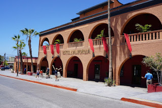 Bueno, panza llena corazón contento, ahora si nos lanzamos al Pueblo Mágico de Todos Santosun pueblo mágico que se encuentra a 40 minutos al sur de La Paz camino a Los Cabos, desde la llegada enamora, el pueblecito está muy bien cuidado sus fachadas, sus comercios, la vieja Misión y la leyenda, pues aquí está el famoso Hotel California, todo en su conjunto pintoresco con un aire vintage, en un ambiente cálido, ideal para caminar y quedarse a comer. Por supuesto entramos al famoso hotel yes en verdad acogedor.