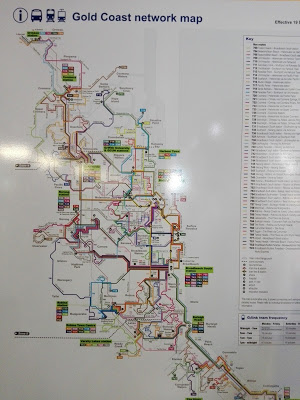 Después de llegar a la estación en Gold coast hay que tomar un autobús para llegar a la zona de las playas, nosotros tomamos la línea 740 que nos dejó cerca de Mermaid Beach y de aquí caminamos por la orilla del mar hacia Surfers Paradise les dejo el mapa de lineas que van a las playas.