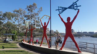 Caminamos por South Bank a la orilla del río, donde encontramos un pabellón de arte y cultura muy divertido así como muchos restaurantes donde comer, el favorito de nosotros de comida Hindú por supuesto, gandhisouthbank.com.au que se encuentra a una calle de la orilla del rio, los jardines de South bank están llenos de vida, decenas de estudiantes están tirados al sol, en la hora del lunch y muchos otros tomando clases, la actividad en el río es sorprendente muchos kayaks, lanchas de motor, acua motos y barcos que te dan tour. El costo de este tour ronda por los 45 dólares por persona así que preferimos caminar y así le dimos la vuelta a Brisbane, subiendo por el emblemático puente Story Bridge y desde aquí pudimos ver algunos de los barrios de Brisbane, llegamos a Kangaroo Point en donde se puede hacer rapel y desde donde se tiene una panorámica de la ciudad. También encontramos dentro de los jardines un templo Hindú muy lindo.
